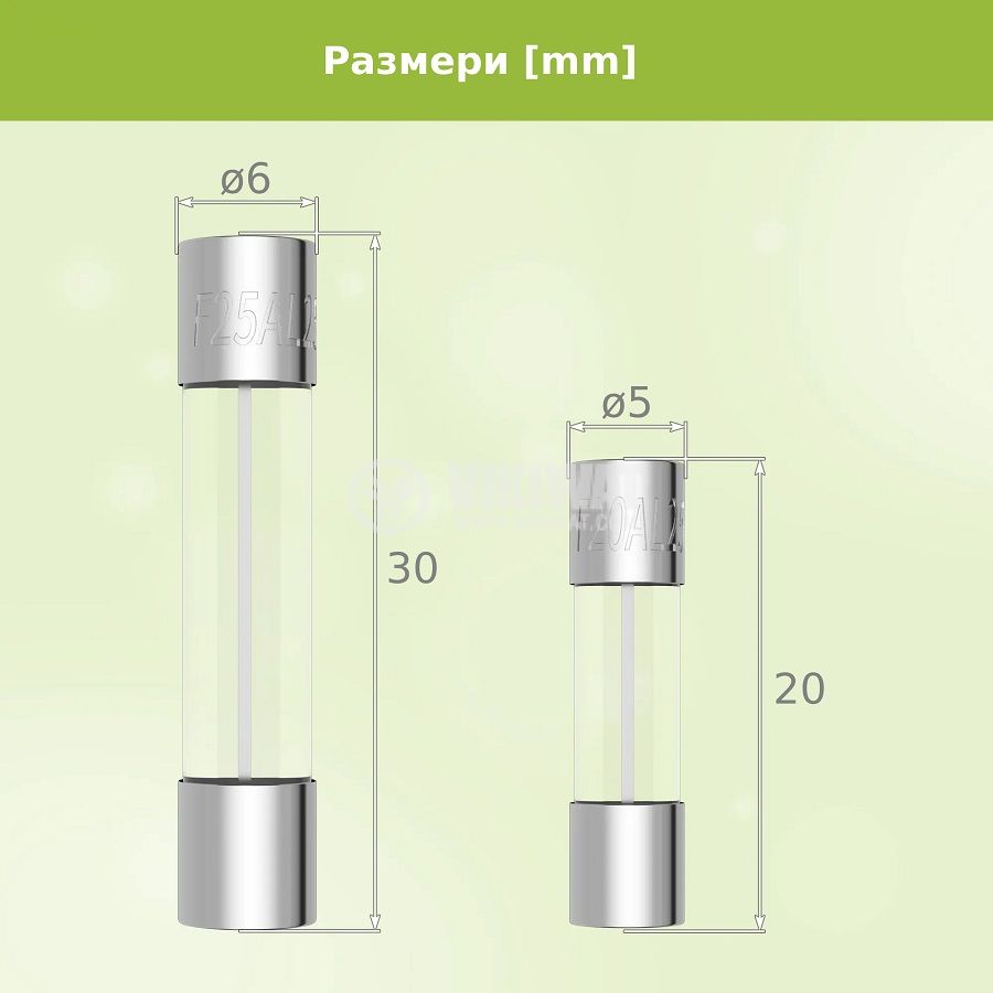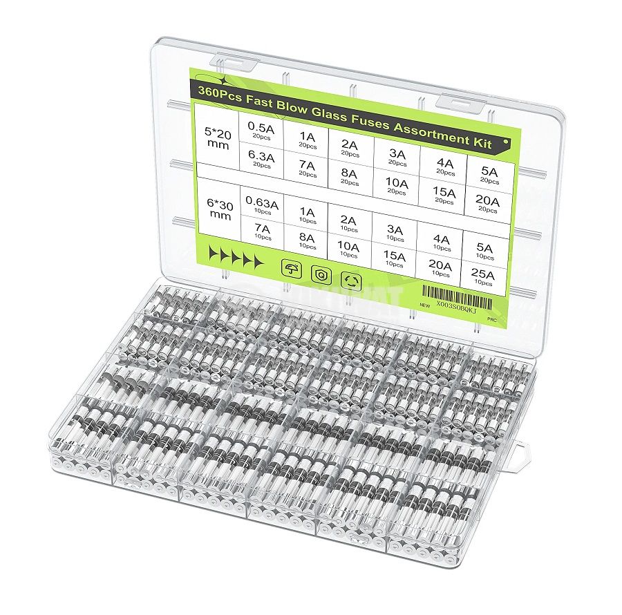 Комплект стъклени препазители 360 бр. в кутия. Комплекта съдържа предпазители 5x20 mm с номинален ток - 0.5A, 1A, 2A, 3 A, 4A, 5A, 6.3A, 7A, 8A, 10A, 15A и 20А, както и размер 6x30 mm - 0.63А, 1А, 2А, 3А, 4А, 5А, 7А, 8А, 10А, 15А, 20А и 25А.