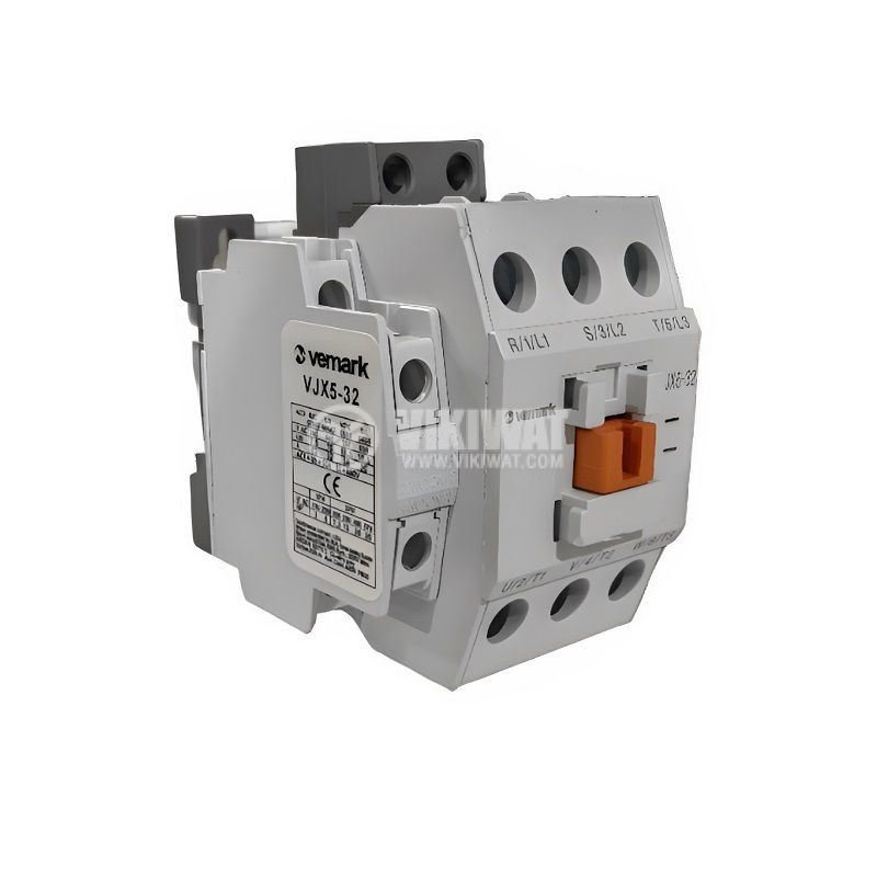 Триполюсен контактор модел VJX5-32 бобина 230 VAC с номинален ток на контактната система 32 A и спомагателни контакти NO + NC.