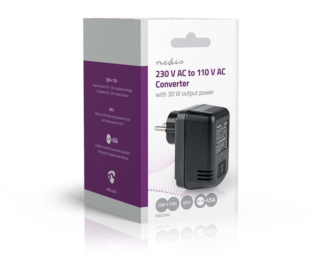 Конверторът на Nedis се използва за уреди внесени от САЩ с максимална мощност до 30 W. За електронни устройства работещи със захранващо напрежение 110 VAC като LED или LCD монитори, малки електроуреди и др.