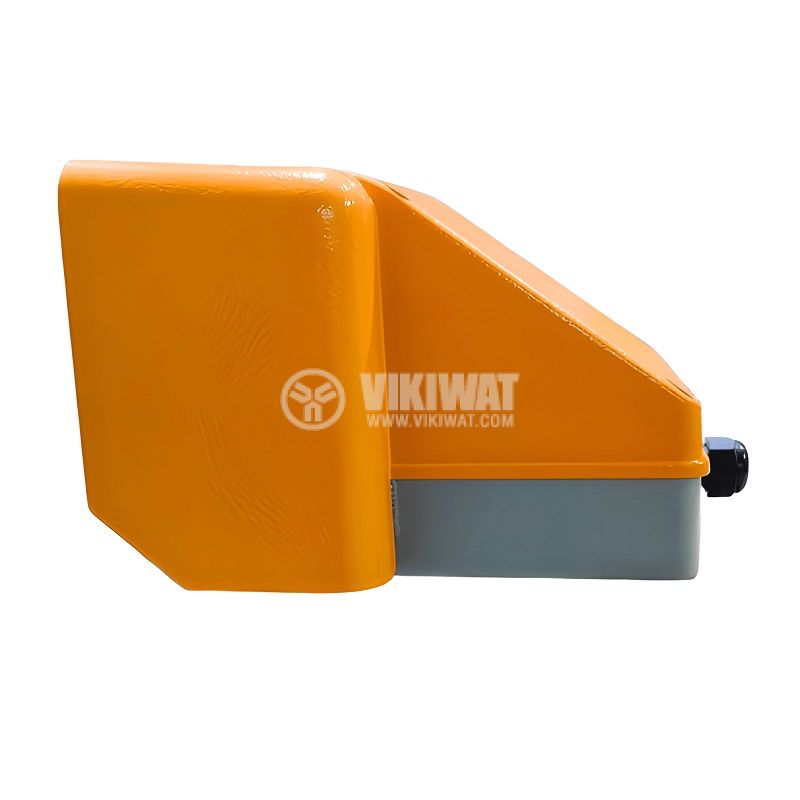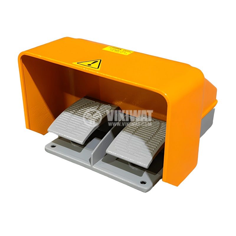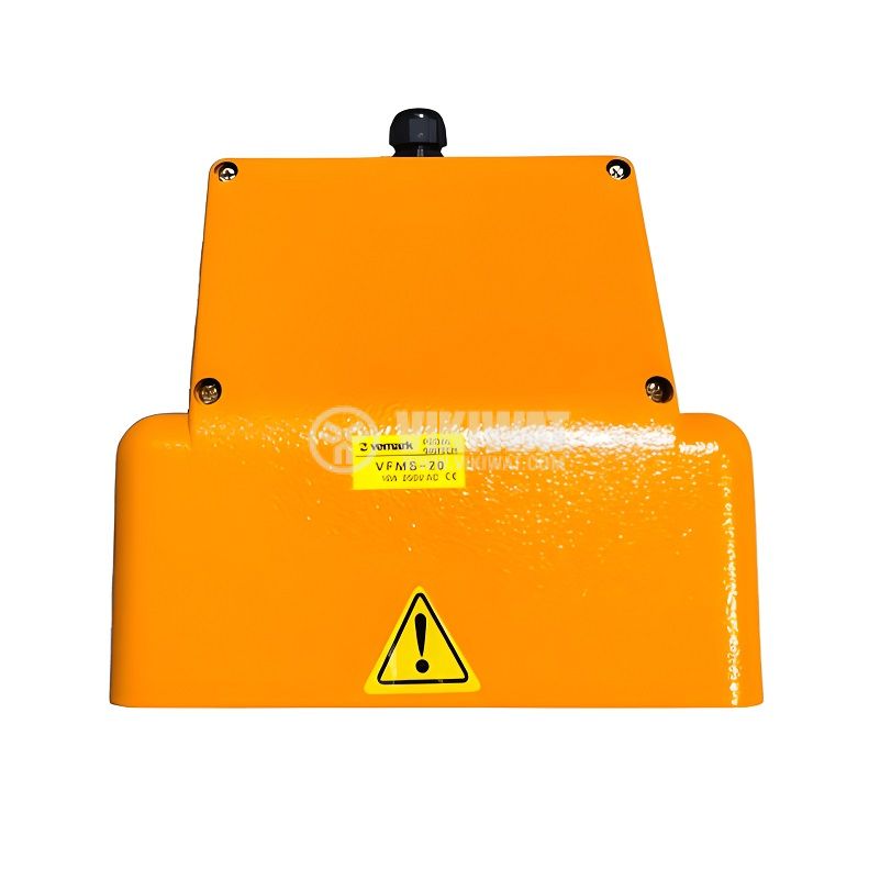 Метален крачен превключвател тип педал VFMS-20, номинално напрежение 250 VAC, максимален ток 10 A, контактна система SPDT+SPDT с контакти NO+ NC и висока степен на защита IP65.