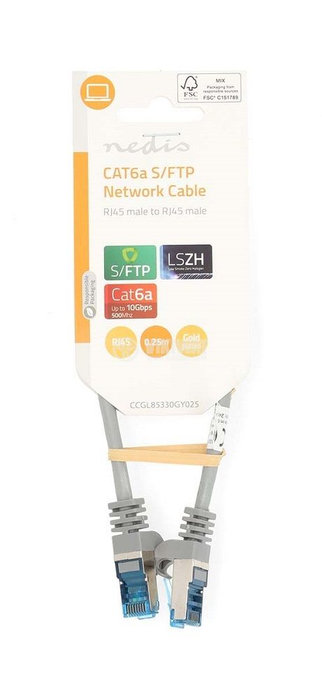 Висококачествен мрежови LAN кабел CCGL85330GY025 от NEDIS, S/FTP, cat. 6a, с медни жила, в сив цвят и дължина, 0.25 m. Подходящ за високоскоростни компютърни мрежи до 1000 Mbps. Гарантиран дълъг живот и устойчивост на външни влияния.
