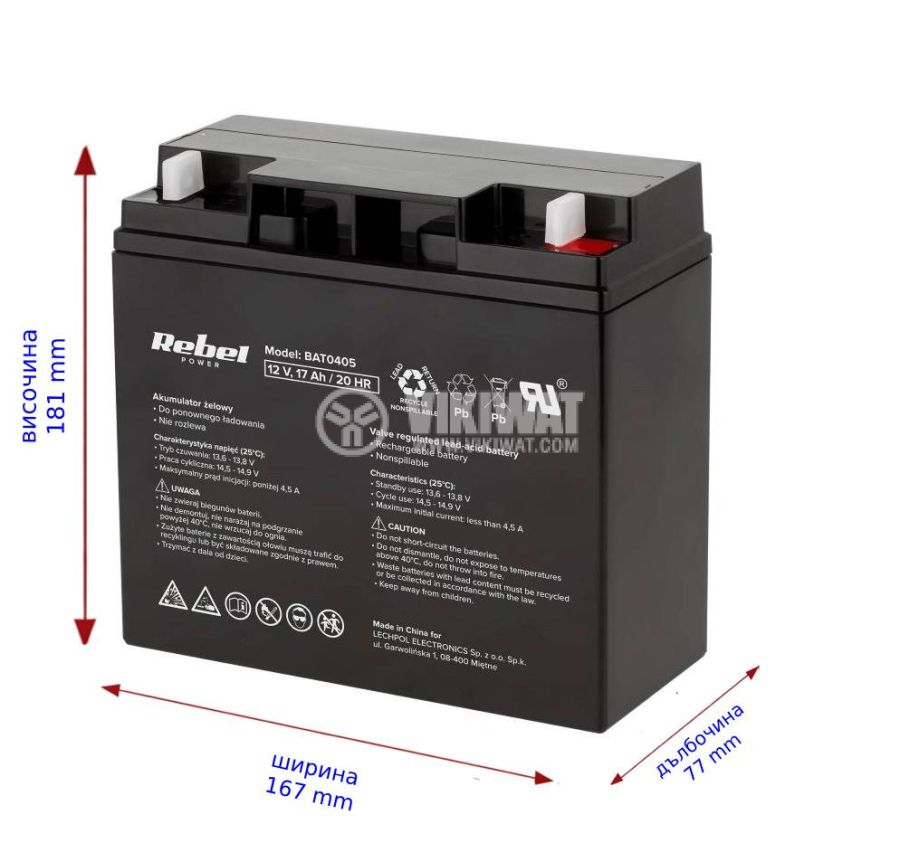 UPS battery BAT0405 lead acid, non-serviceable, at 12 V / 17 Ah. Suitable for UPS power supplies with long life. Dimensions - 181x77x167 mm. Rechargeable, encapsulated rechargeable battery.