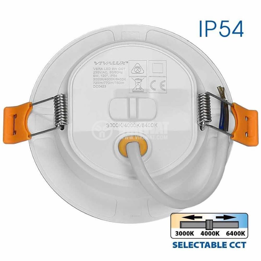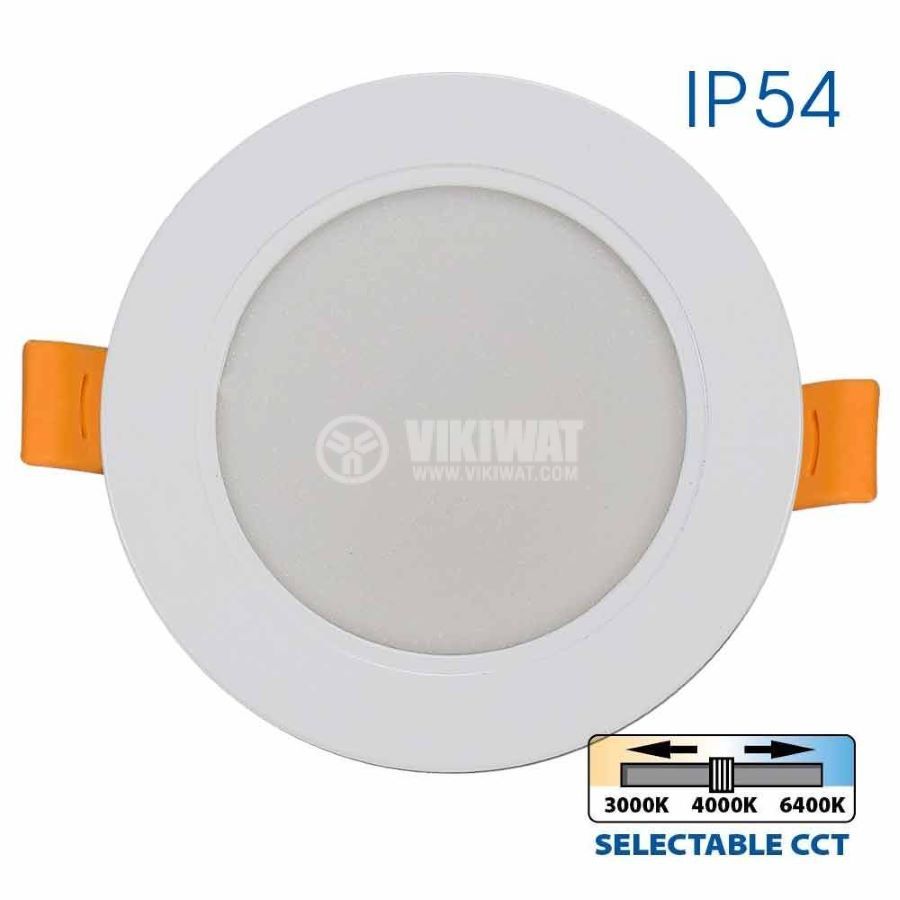 Moisture-proof LED lighting moon, suitable for installation in a suspended ceiling with a power of 9 W, luminosity of 750 lm, operating voltage of 230 VAC and protection class IP54. The moon has 3 colors of light that can be changed. Suitable for use in wet rooms, bathrooms, kitchens, where there is an increased level of humidity.