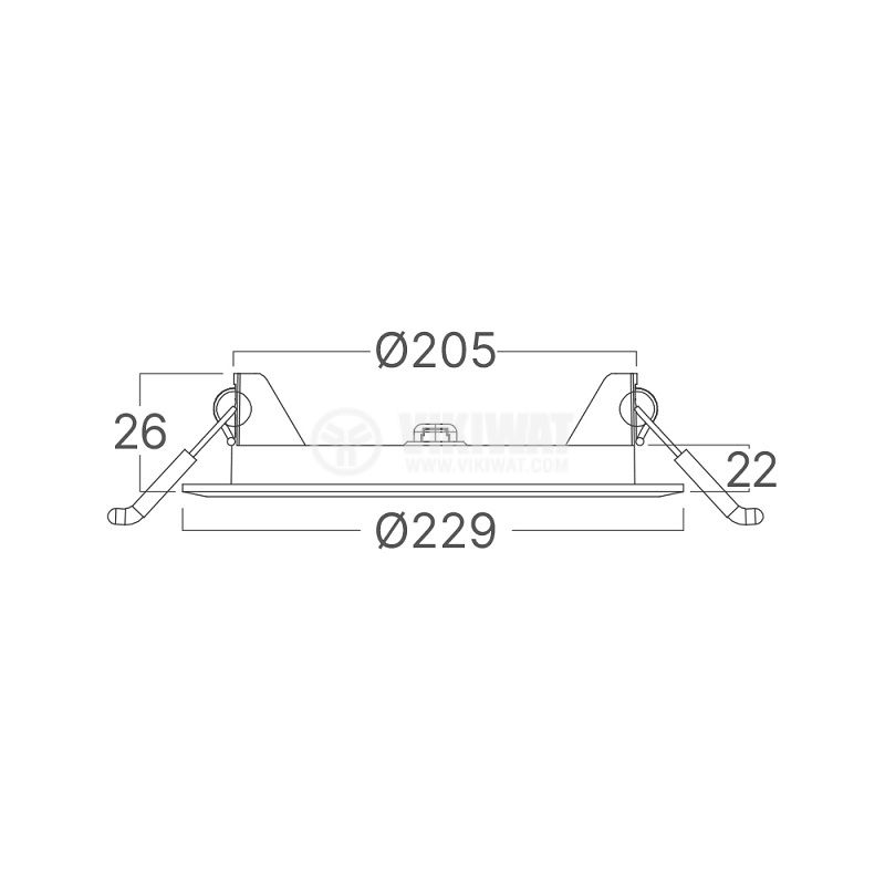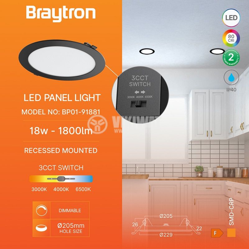 LED recessed panel with a diameter of 205 mm from BRAYTRON, model BP01-91881, with a power of 18 W and a luminous flux of 1800 lm, offering a choice between warm, neutral and cold white light. Suitable for general lighting, with dimensions ф229x26 mm and a power supply of 230 VAC.