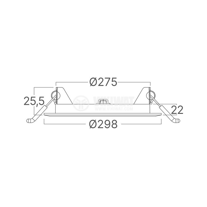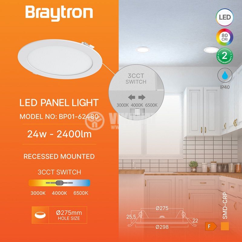 LED панел за вграждане с диаметър 275 mm от BRAYTRON, модел BP01-62480, с мощност 24 W и светлинен поток 2400 lm, предлагащ избор между топло, неутрално и студено бяла светлина. Подходящ за основно осветление, с размери ф298x26 mm и захранване 230 VAC.