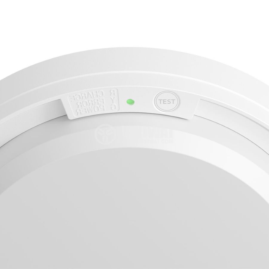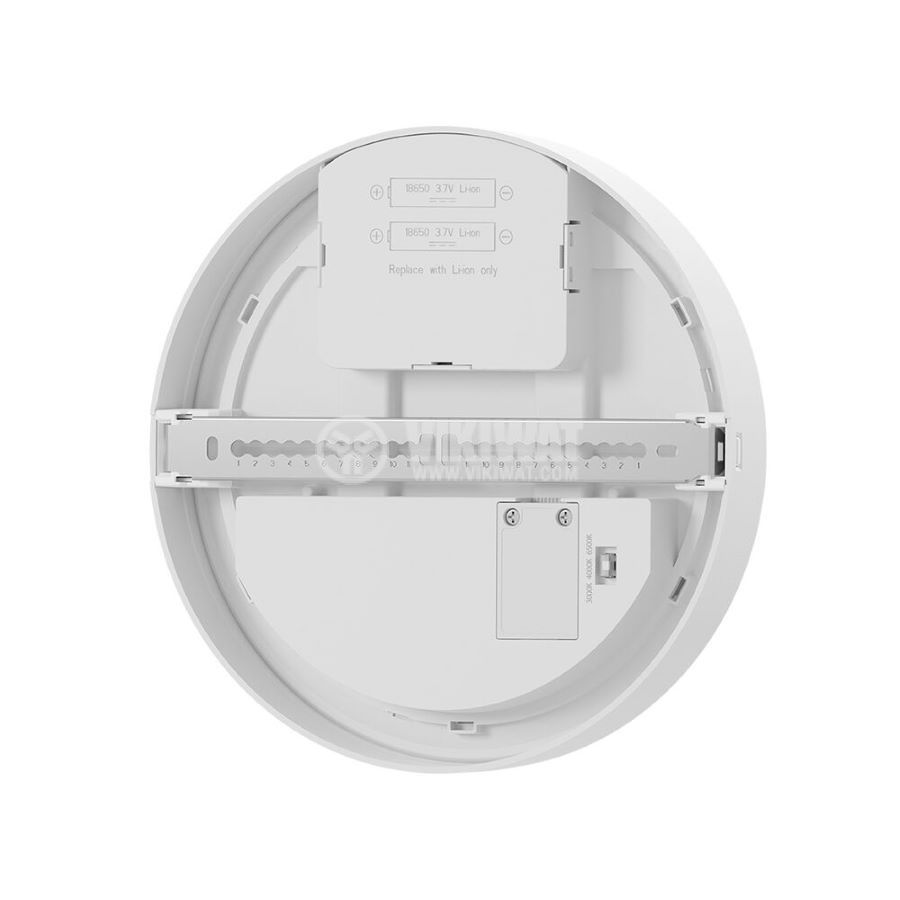 Влагозащитен LED панел за повърхностен монтаж от Braytron с размер ф222 mm, мощност 18 W, светлинен поток 2000 lm, с три цвята на светене - топлобял, студенобял и неутрален цвят. Плафонът е със сензор за движение и резрвно захранване 2x1800mAh 3.7V Li-Ion aкумулаторни батерии.