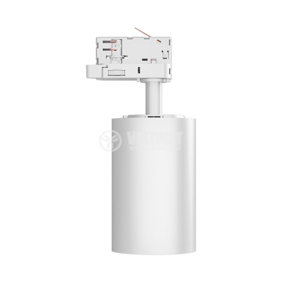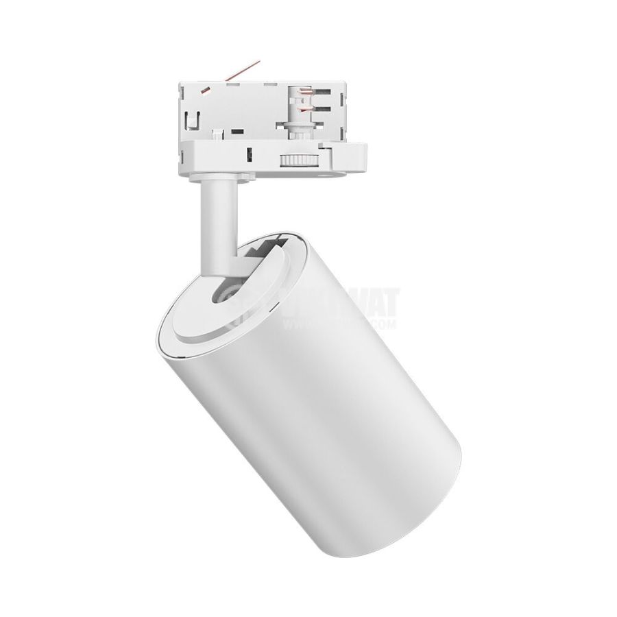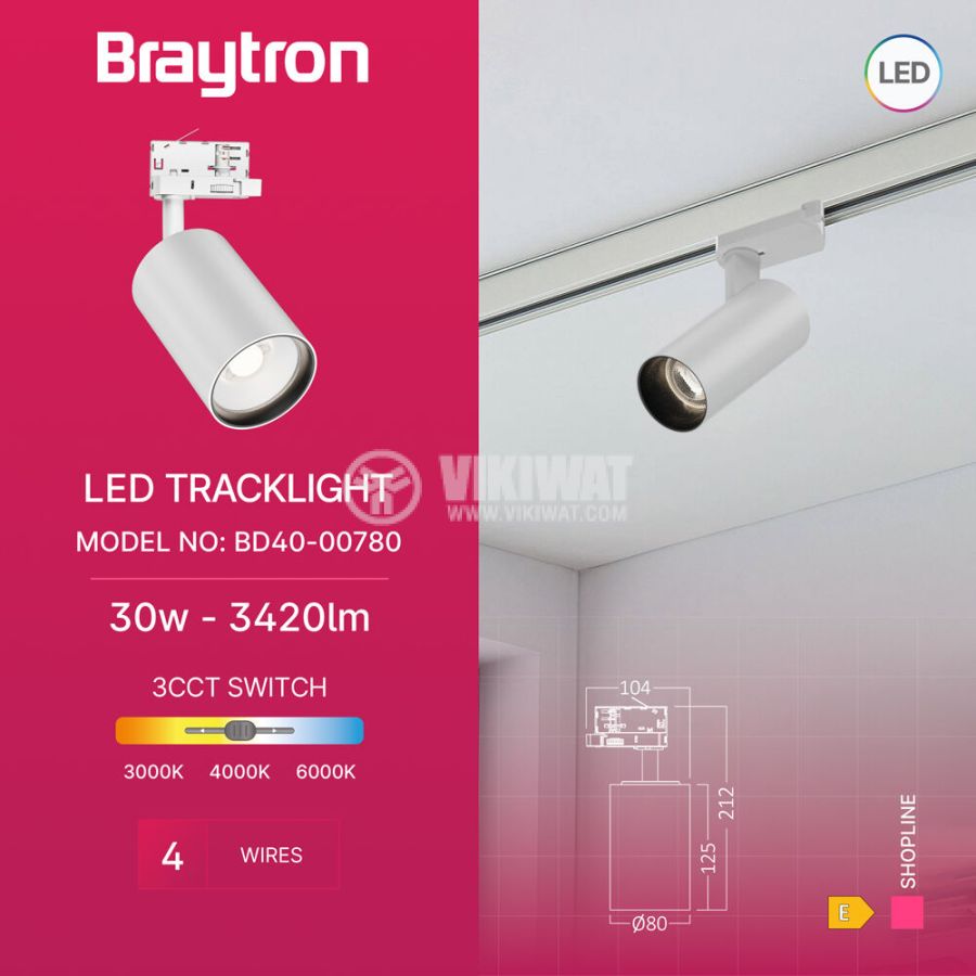 LED прожектор за четирипроводна шина (релса) от Braytron, захранващо напрежение 230VАC, мощност 30 W, светлинен поток от 3420 lm с възможност за светене 3 цвята топло, неутрално и студено бяла светлина.