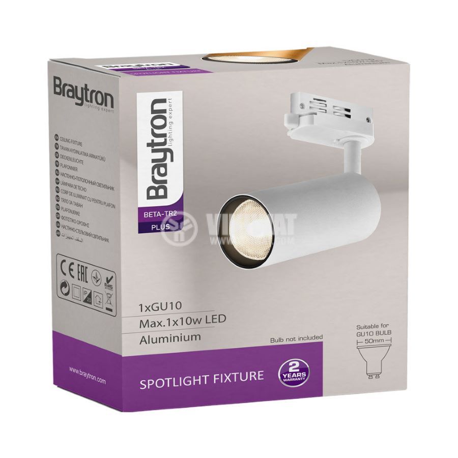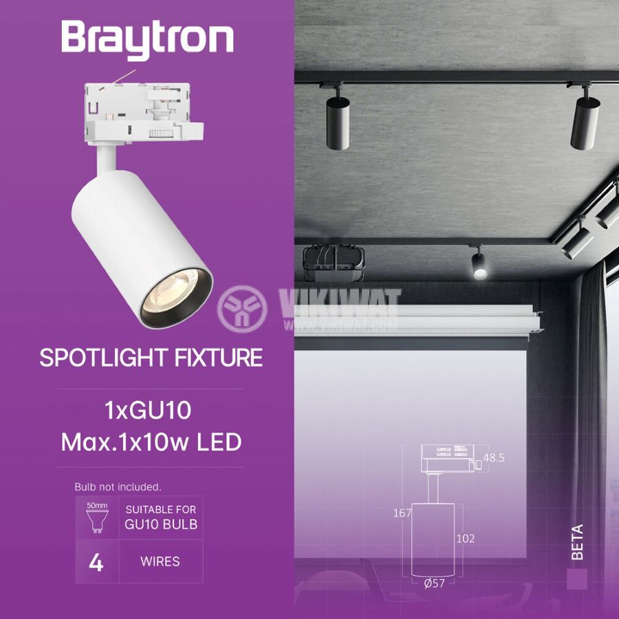 LED релсов прожектор Braytron BH04-60600, за четирипроводна релса, със степен на защита IP20, за 1 x GU10 крушка с максимална мощност 10 W (не е включено в комплекта). Алуминиев корпус. Лесна и бърза инсталация. Без крушка в комплекта.
