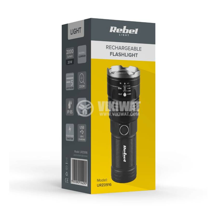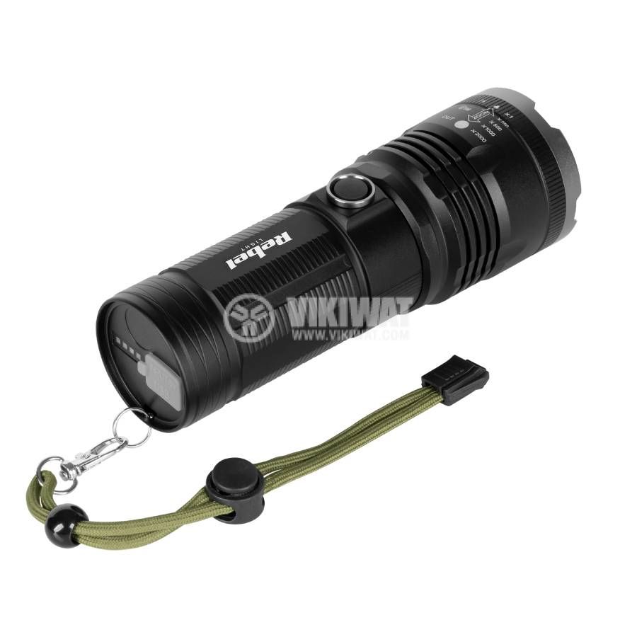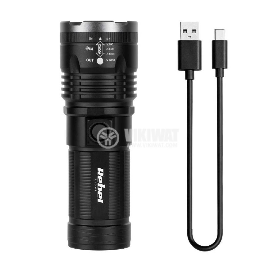Алуминуев LED фенер от Rebel, със силна, ярка светлина със светлинен поток 2000 lm, с мощна акумулаторна батерия 4500 mAh, която се зарежда с USB-C ( включен в комплекта).