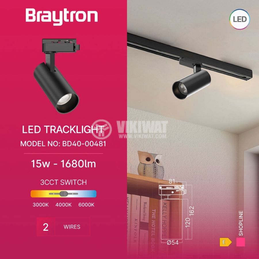 LED track spotlight from Braytron, supply voltage 230VAC, power 15 W, luminous flux of 1560 lm with the ability to emit 3 colors of warm, neutral and cold white light.