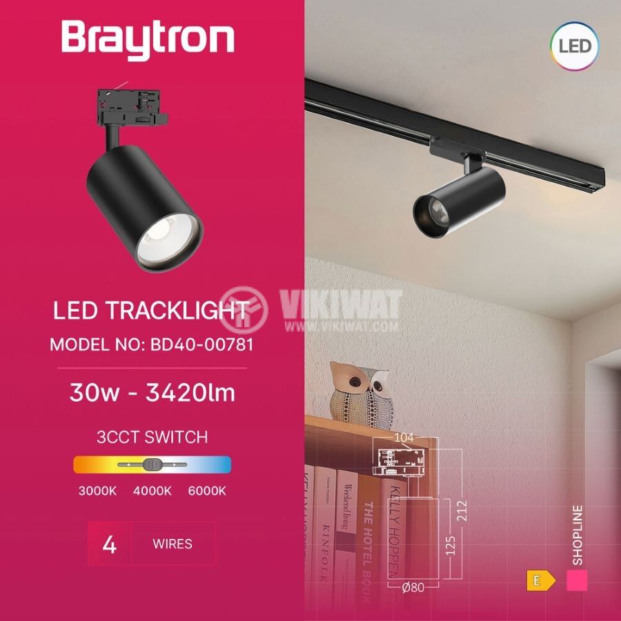 LED track spotlight from Braytron, supply voltage 230VAC, power 30 W, luminous flux of 2960 lm with the ability to emit 3 colors of warm, neutral and cold white light.