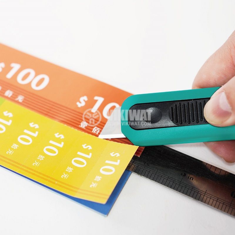 Практичен макетен нож, подходящ за рязане на хартия, картон, тънка пластмаса и опаковки в ежедневни, монтажни и ремонтни дейности. С компактна дължина 134 mm и заключващ механизъм, инструментът осигурява безопасност и прецизност при работа. Благодарение на удобната дръжка от ABS пластмаса, ножът предлага стабилен захват и комфорт при продължителна употреба.