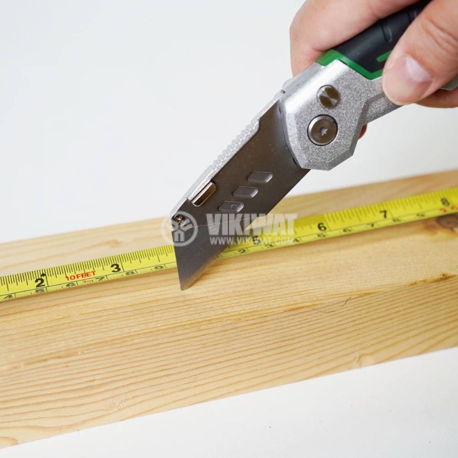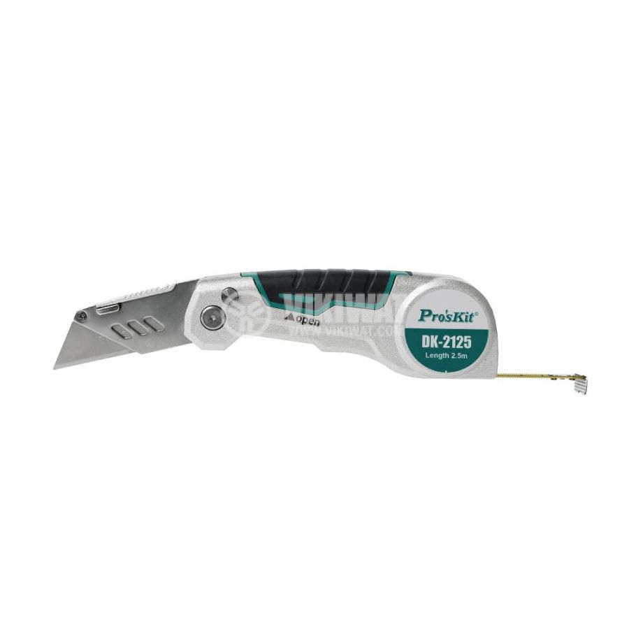 Професионален макетен нож DK-2102 от PRO'S KIT със сгъваемо острие и сменяеми ножчета, има и вградена ролетка, дължина 158 mm. С отделение за остриета и две резервни ножчета в комплекта.