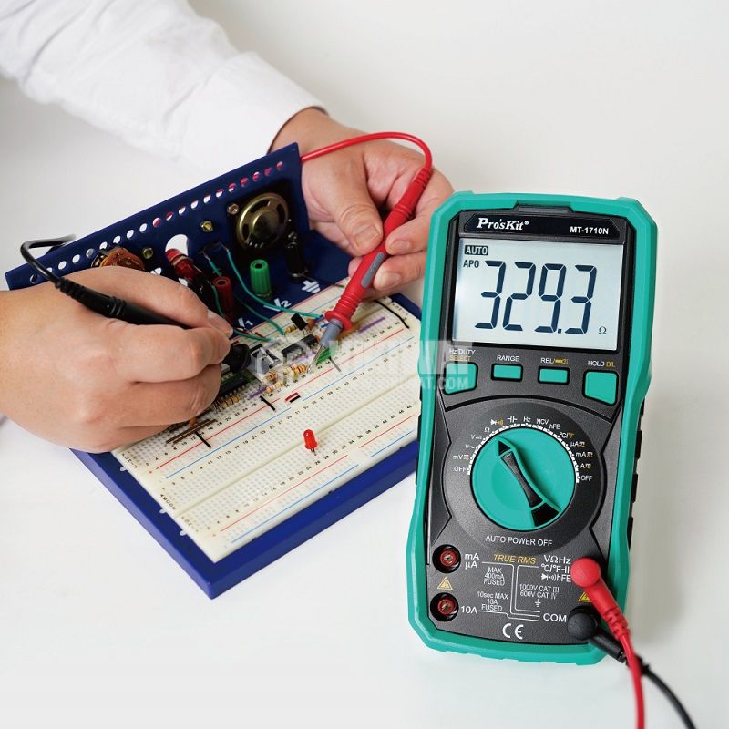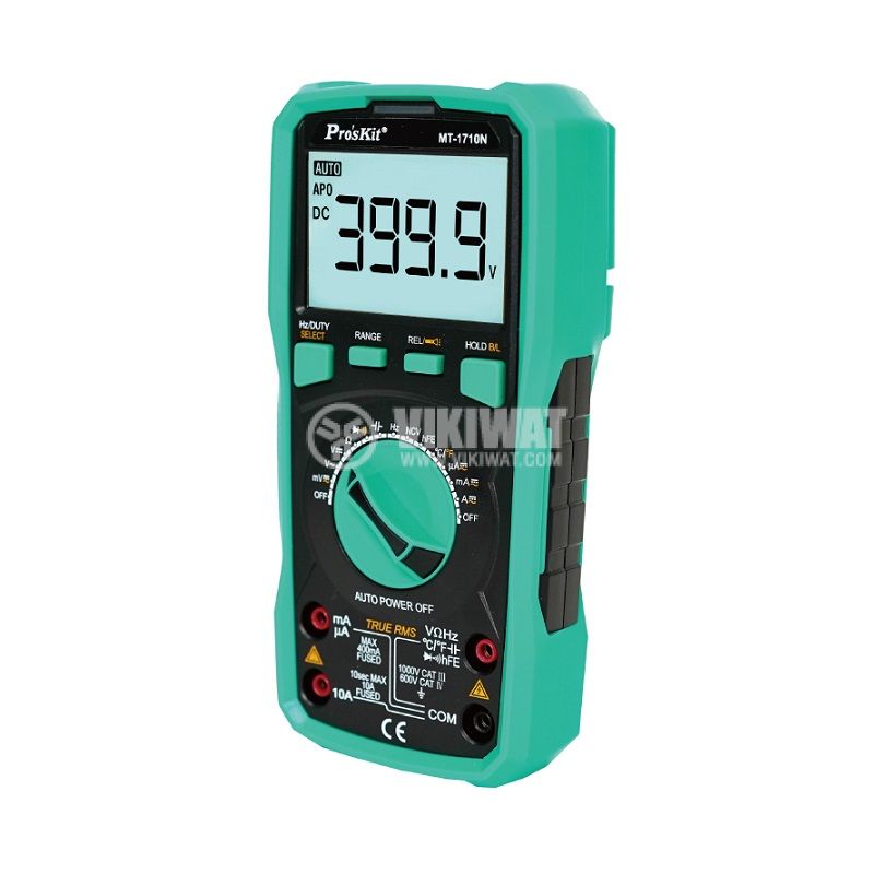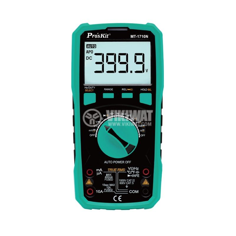 Професионален, прецизен мултицет MT-1710N от PRO'S KIT, дигитален, с възможност за измерване на постоянно и променливо напрежение, големина на електрически AC / DC ток, съпротивление, капацитет, както и разполага с True RMS измерване на несинусуидални сигнали. Има възможност за измерване на температура&nbs...