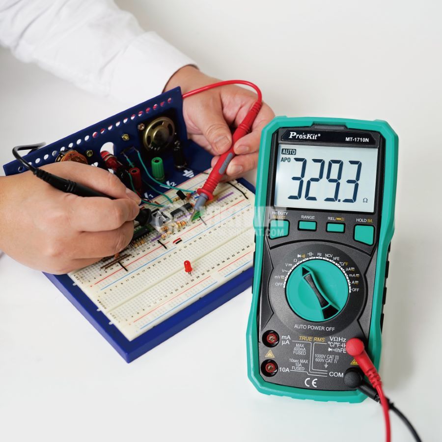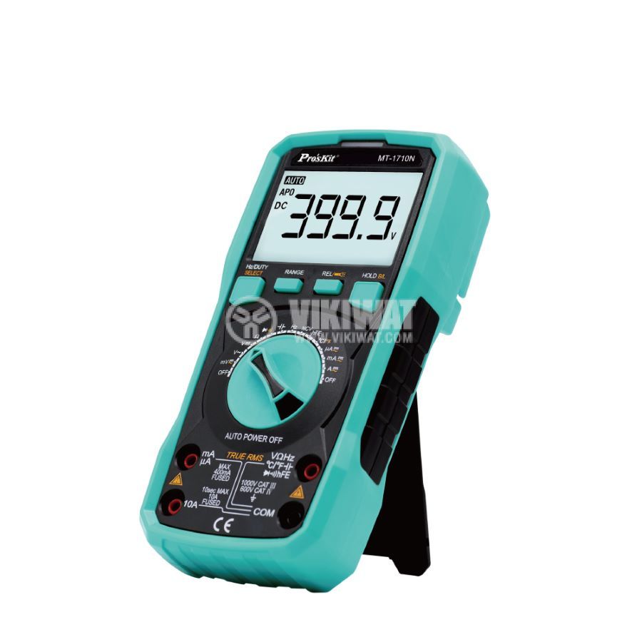 Професионален, прецизен мултицет MT-1710N от PRO'S KIT, дигитален, с възможност за измерване на постоянно и променливо напрежение, големина на електрически AC / DC ток, съпротивление, капацитет, както и разполага с True RMS измерване на несинусиална сигнали. Има възможност за измерване на температура от -40 до 1000 °C.