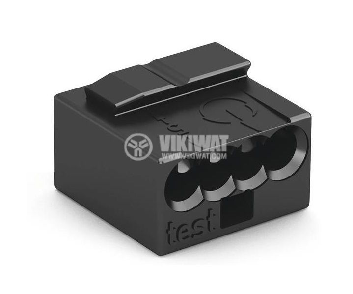 WAGO screwless terminal block (quick connection) for five solid, copper or aluminum conductors with a cross section from 0.75 to 4 mm2, load capacity 450 V / 32 A, dimensions 10x10x6.8 mm and black color.