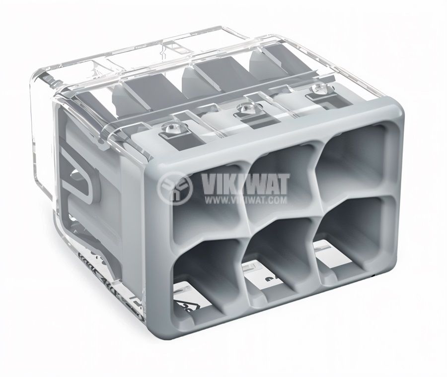 WAGO screwless terminal block (quick connection) for six solid, copper or aluminum conductors with a cross section from 0.75 to 4 mm2, load capacity 450 V / 32 A, dimensions 18.6x16.4x11.3 mm and grey color.
