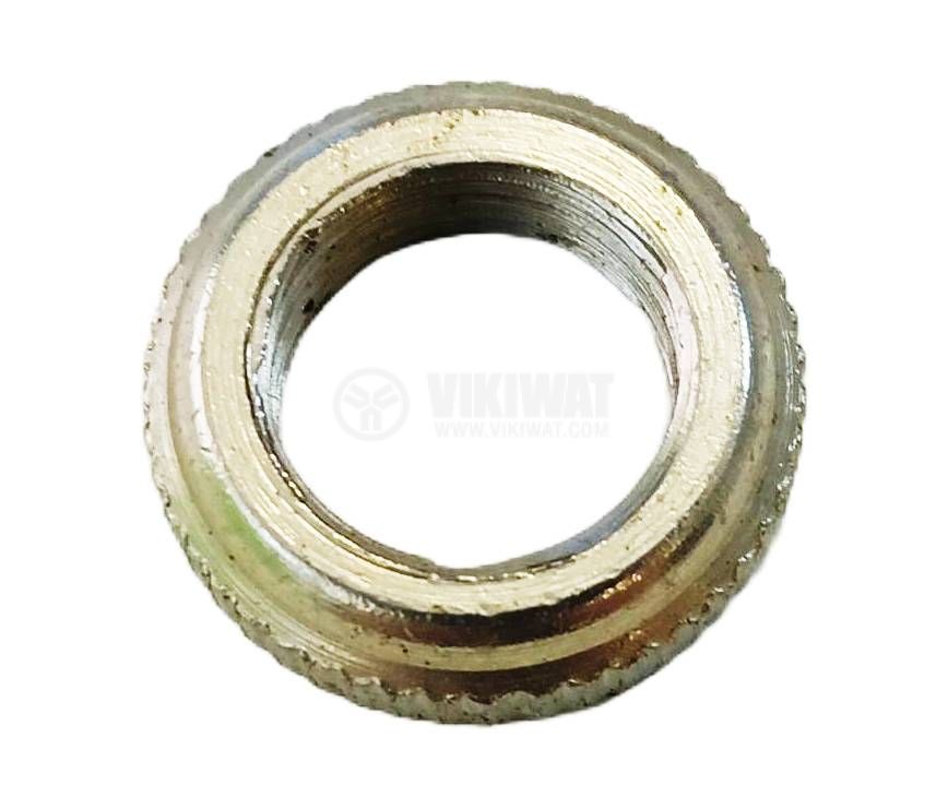 Nut M6, hexagonal, metal with outer diameter ф12 mm and inner ф5 mm.
