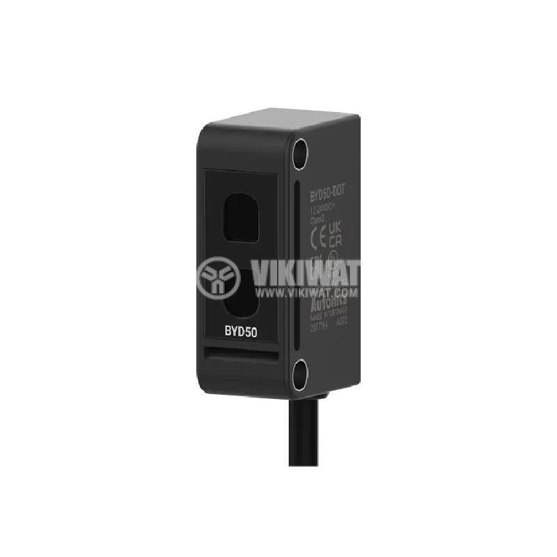 Фотоелектричен датчик, отражателен, преход NPN, с работно разстояние от минимално 10 до 50 mm. Електрическо свързване чрез кабел с дължина 2 m, възможност за регулиране на чувствителността.