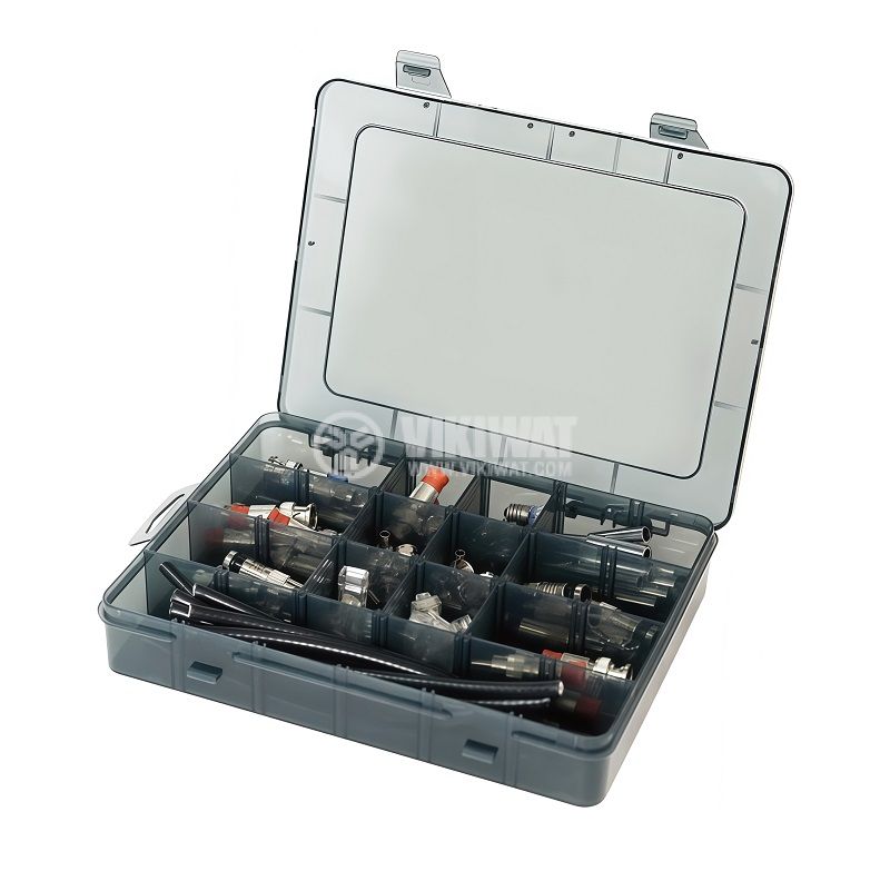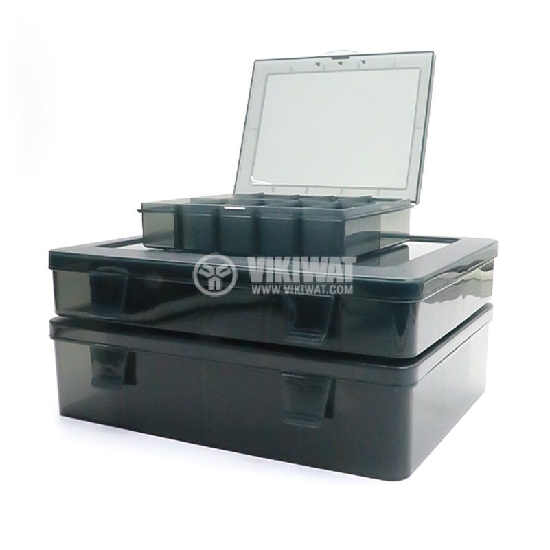 Практичен органайзер за съхранение на инструменти, крепежи и дребни консумативи, подходящ за работилници, сервизи и домашна употреба. С компактни размери и прозрачeн капак, осигурява бърз достъп и добра видимост на съдържанието.