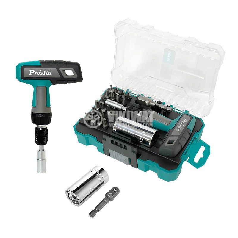 Комплект инструменти SD-2325 от PRO'S KIT съставен от 25 части изработени от хром-ванадиева стомана поставени в здрава и компактна кутия. Комплектът съдържа тресчотка, отвертки, вложки и битове.