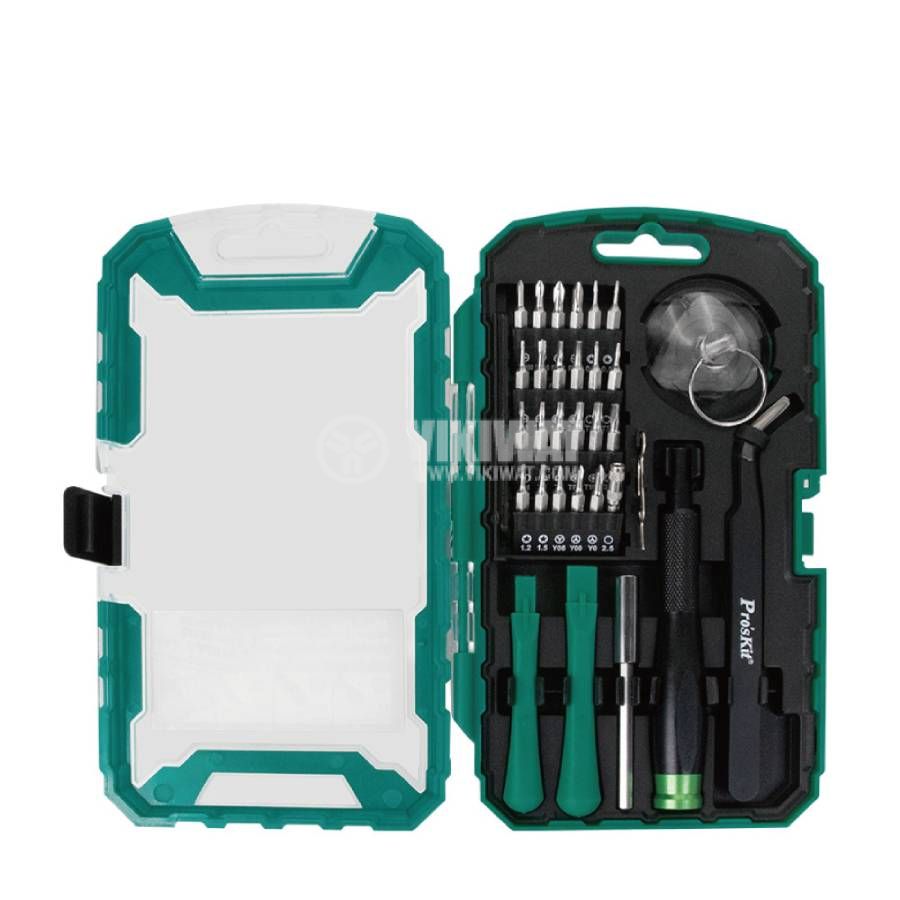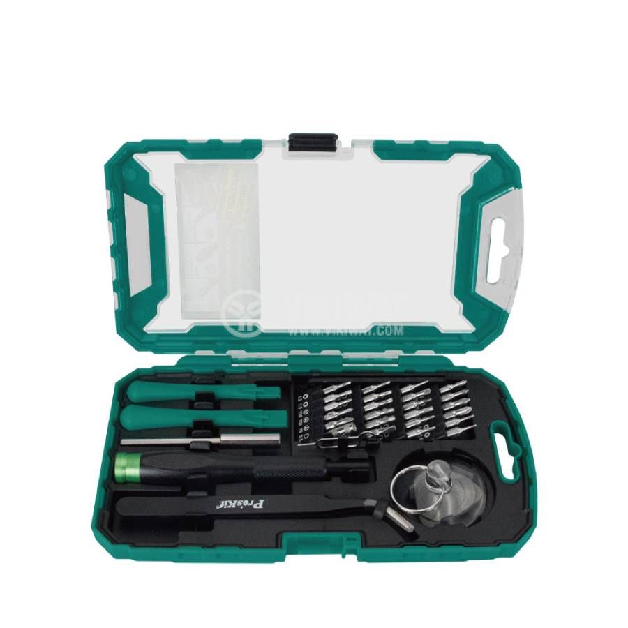 Комплект от PRO'S KIT на отвертка с битове, както и допълнителни аксесоари и инструменти за всякакви ремонти, сервиз или сглобяване / разглобяване финна техника като таблети, телефони, лаптопи и друга техника.