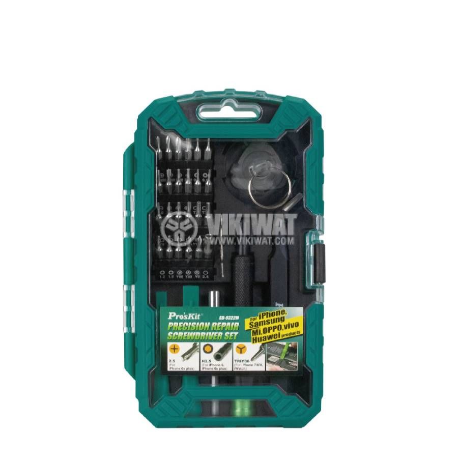 Комплект от разнородни инструменти, както и отвертка със сменяеми битове, SD-9322M от PRO'S KIT подредени в удобна и здрава кутия. Комплектът е предназначен за ремотн на всякаква финна техника като лаптопи, телефони, таблети.