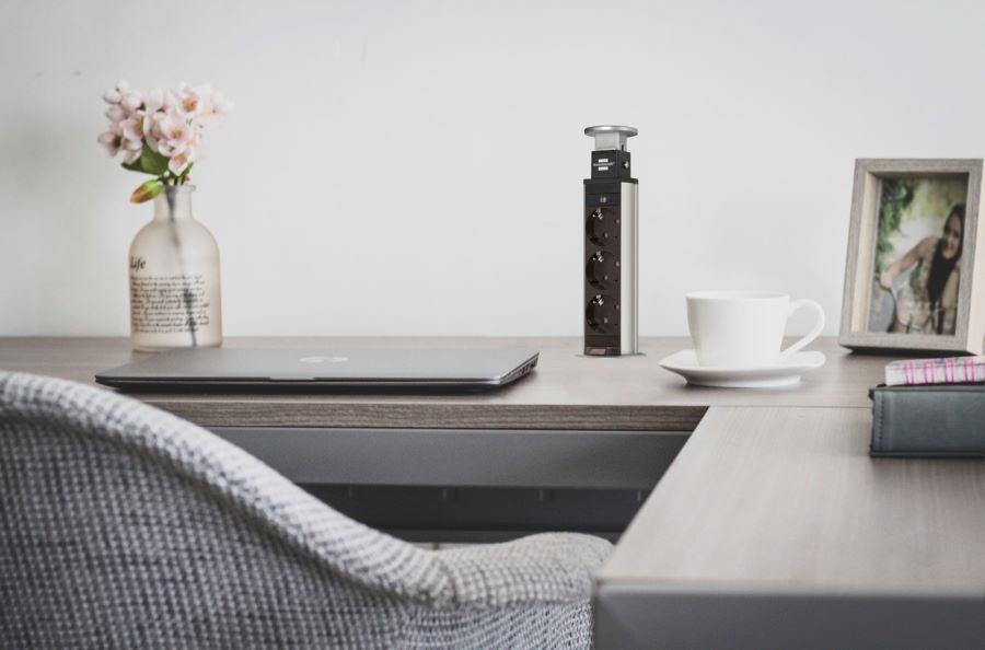 Вертикален разклонител - тип кула, предназначен за вграждане в плотове/ бюра/ работни маси от немския производител Brennenstuhl като предлага опция да се прибере напълно. Вертикален SLIM дизайн със здрав алуминиев корпус. Монтажът е лесен, монтажният отвор е само 60 mm а контактите са с вградена детска защита и са аранжирани под 45 °, което позволява допълнително удобство при употреба на ъглови щепсели.