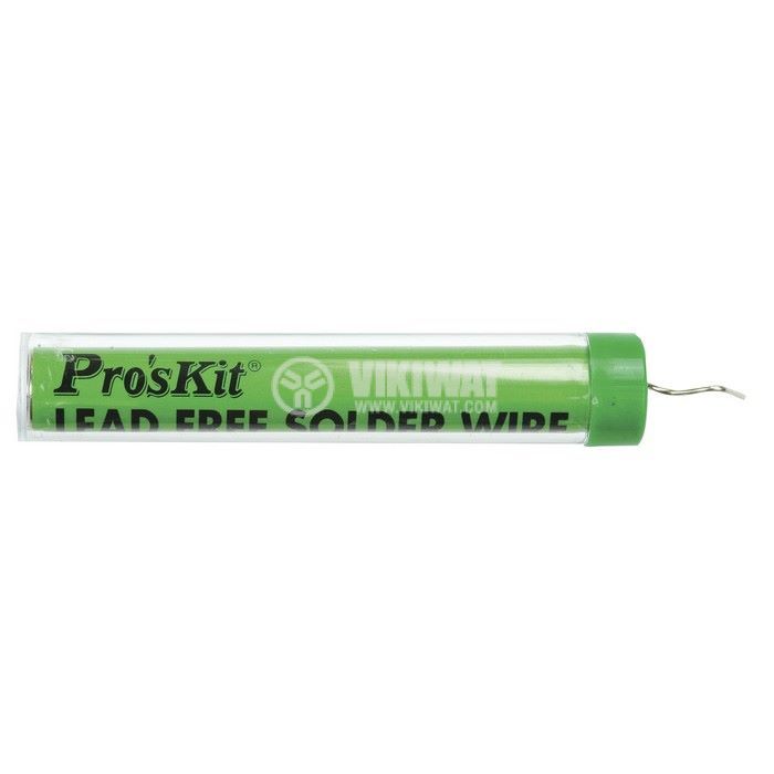 Припой (калай за запояване, тинол) от PRO'S KIT с диаметър ф1 mm, разфасофка от 14g. Съдържание на калай, мед (Sn99.3, Cu0.7) и температура на топене 220 °C.