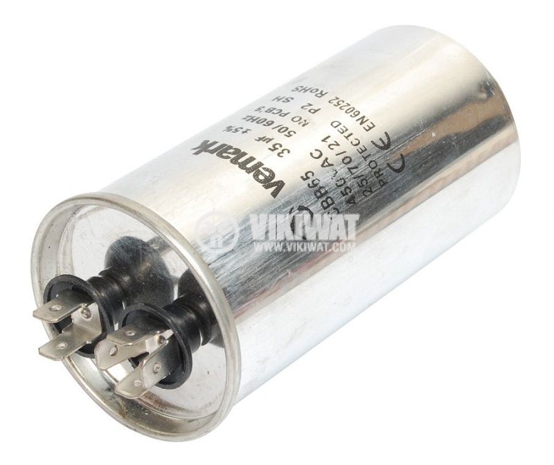 Работен кондензатор за климатик с напрежение 450 VAC, 25 µF и работна температура 70°C. Подходящ за климатици, хладилници, генератори, компресори, ОВК системи и други променливотокови устройства (лампи).
