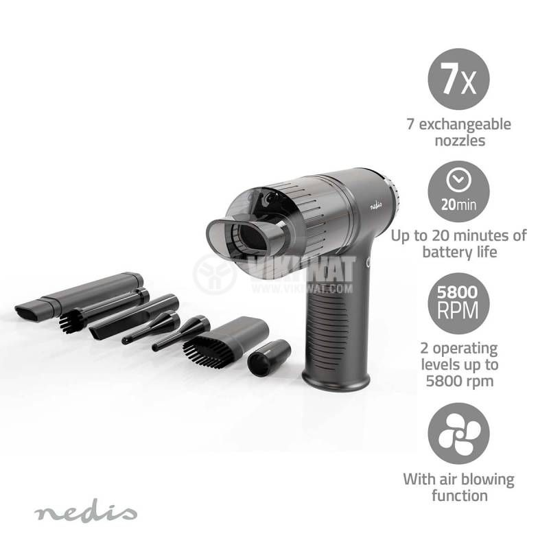Многофункционалната безжична прахосмукачка и вентилатор Nedis е идеална за безконтактно почистване на компютърни аксесоари и други електронни устройства. Може да се използва като мощна алтернатива на сгъстен въздух в кутия. Освен това, може да се използва и за почистване на домакински нужди и автомобили.