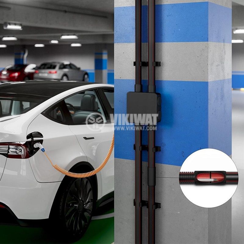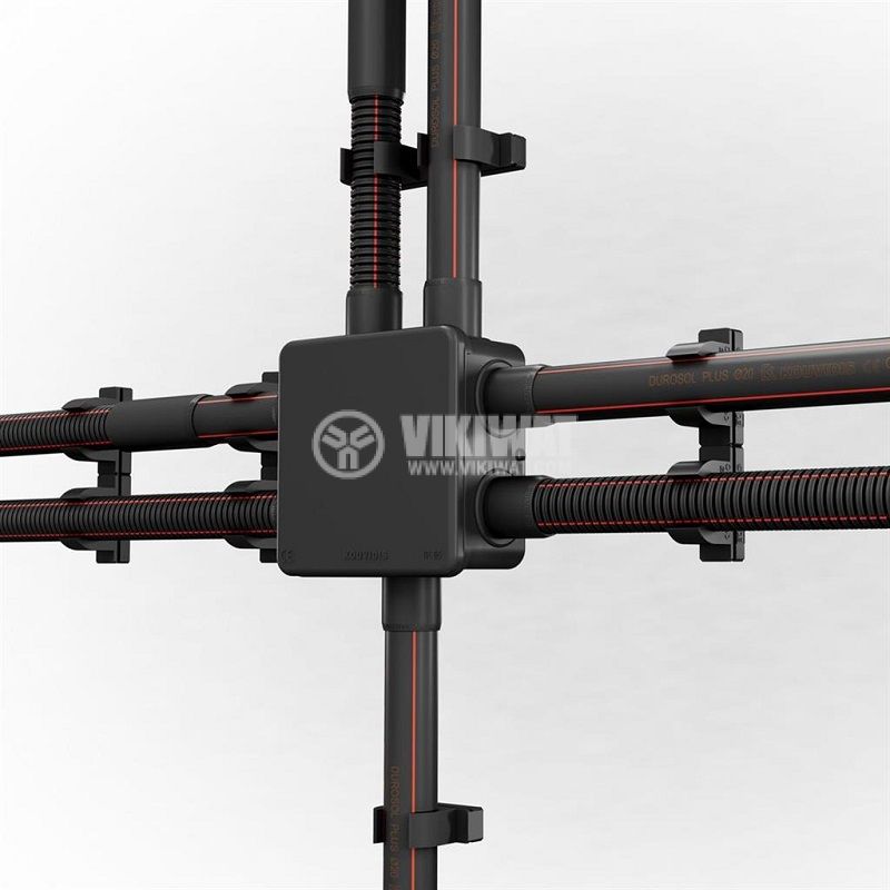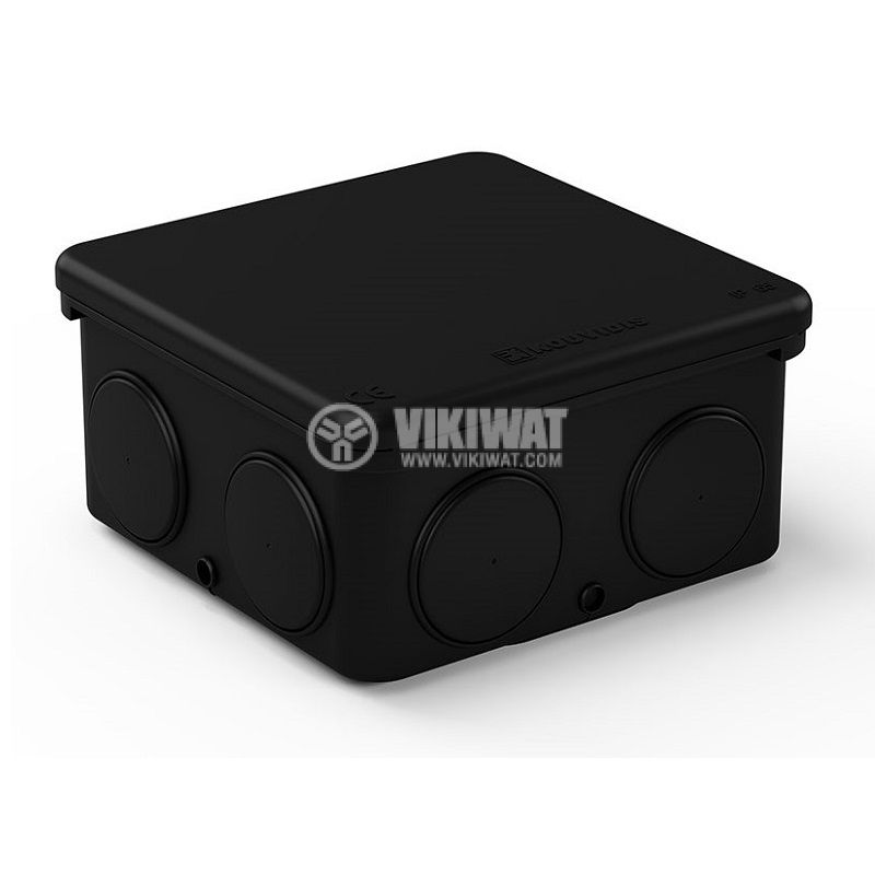 Многофункционална пластмасова кутия за повърхностен монтаж с капак, размери 82 x 82 x 43 mm, степен на защита IP55 и черен цвят.
