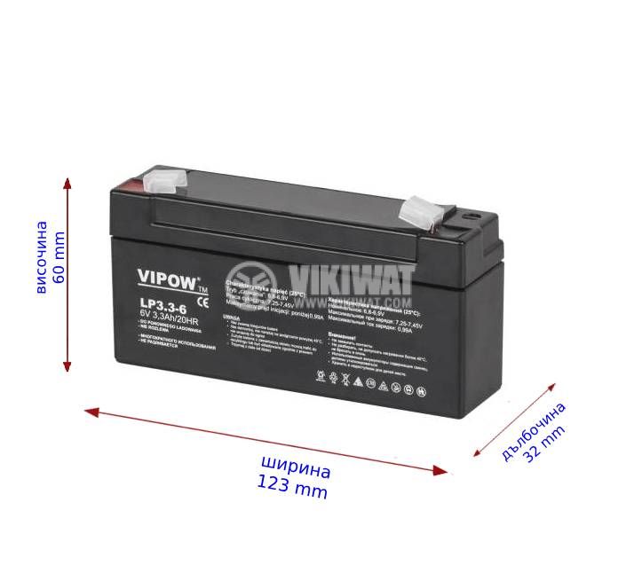 Gel traction battery BAT0205 from VIPOW, specially designed for energy storage, voltage and capacity 6 V / 3.5 Ah. Suitable for medical devices, portable scales, portable power sources. Overall dimensions 123x32x60 mm.