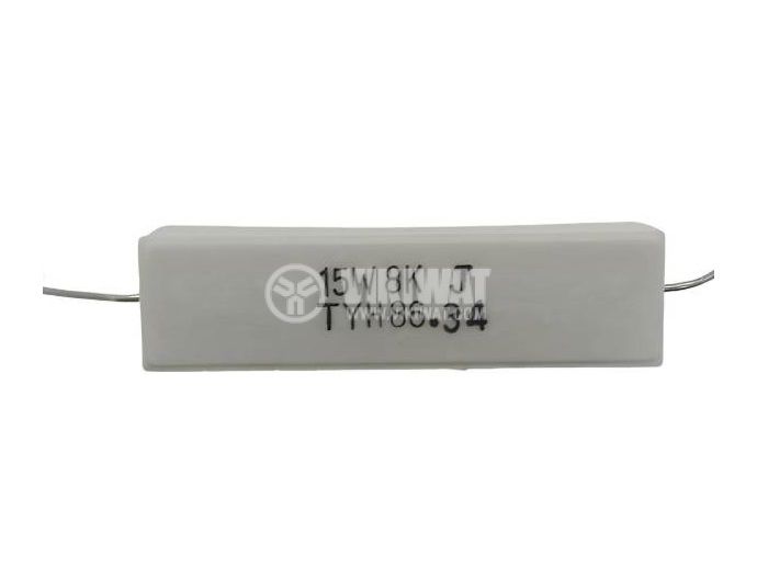 Ceramic resistor with a resistance of 8 кOhm, a power of 15 W and a tolerance of ±0.05%, with a wire lead intended for THT soldering.