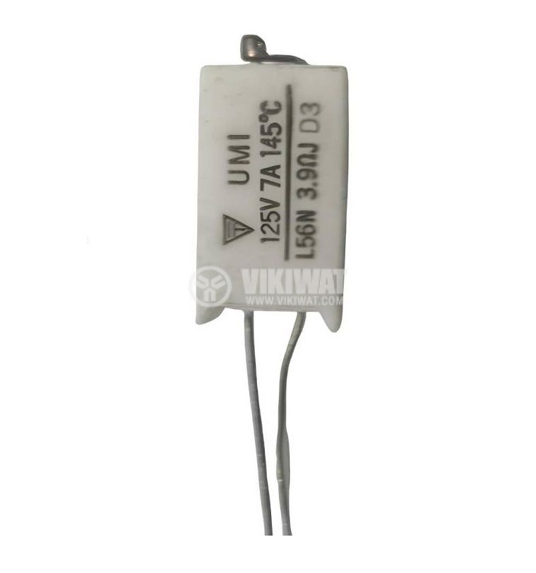 Керамичен резистор със съпротивление от 3.9 Ohm, мощност 7 W и толеранс от ±0.05%, с жичен извод, предназначен за запояване THT.