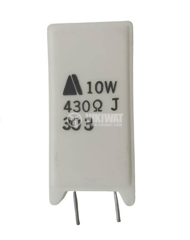 Керамичен резистор със съпротивление от 430 Ohm, мощност 10 W и толеранс от ±0.05%, с жичен извод, предназначен за запояване THT.