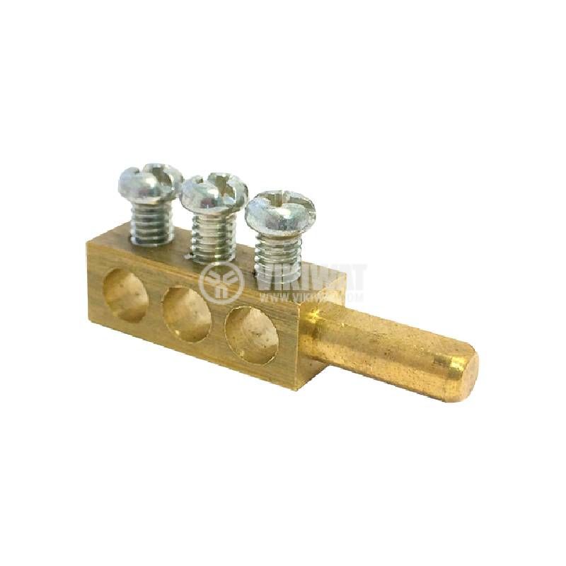 Съединителна клема MAD3016E21 за монтаж на DIN шина от MOREK, неизолирана, дължина 35 mm, с 3 извода за проводници със сечение от 3x16 mm2, максимален ток 63 А и напрежение 690 V.