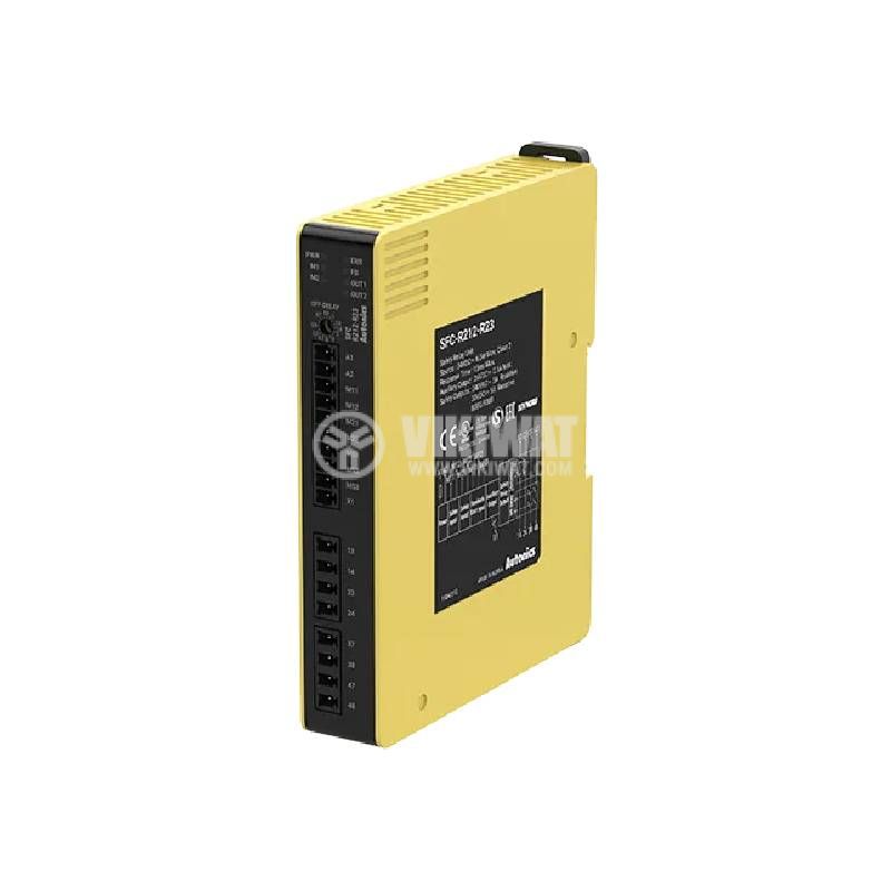 Safety relay SFC-R212-R230-L from Autonics, with dimensions 22.5 x 130 x 115.3 mm. Suitable for DIN rail mounting, with 24 VDC power supply and 2 outputs.