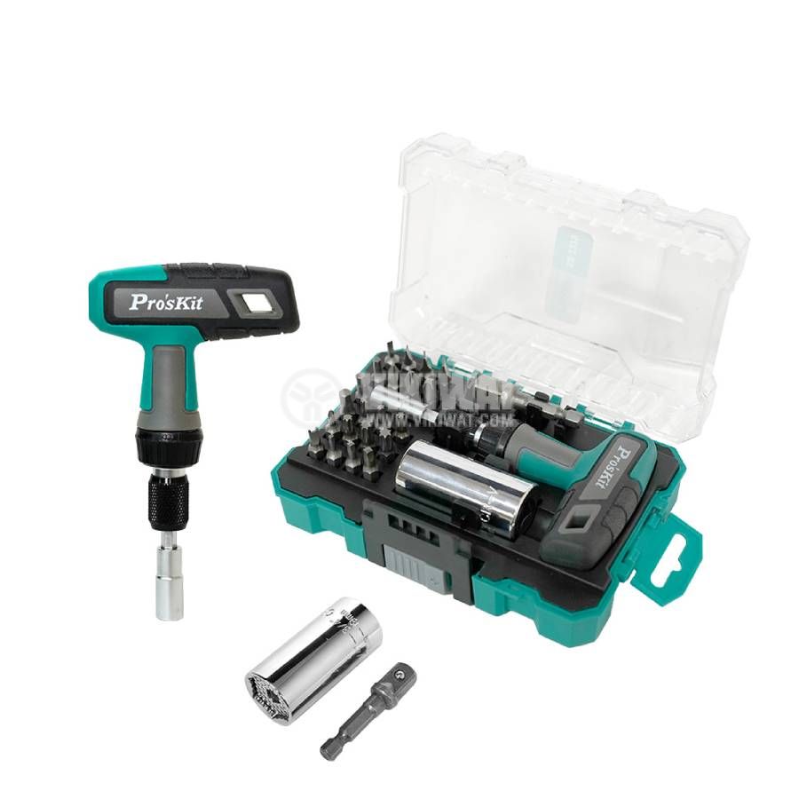 Tool set SD-2325 from PRO'S KIT consisting of 25 parts made of chrome-vanadium steel placed in a strong and compact box. The kit contains a ratchet, screwdrivers, inserts and bits.