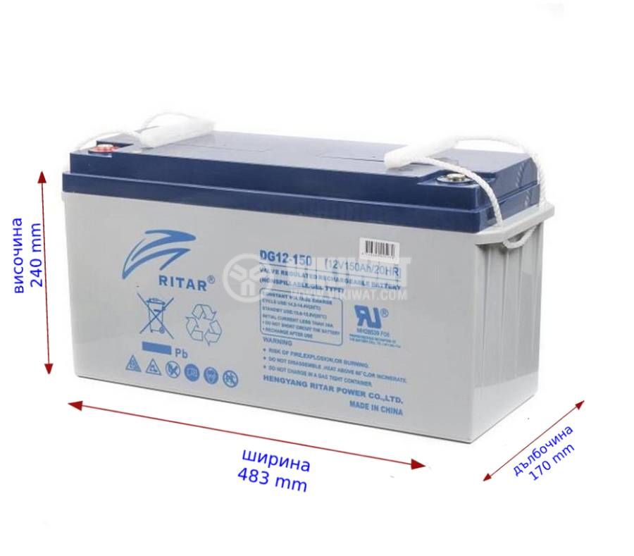 Rechargeable Gel battery DG12-150 lead-acid, maintenance-free, RITAR, at 12 V / 150 Ah. Suitable for emergency power supplies, security systems, electric vehicles, etc. Dimensions - 483x170x241 mm. Rechargeable, encapsulated rechargeable battery.