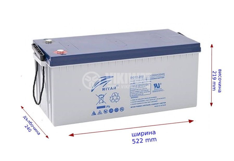Rechargeable Gel battery DG12-200 lead-acid, maintenance-free, RITAR, at 12 V / 200 Ah. Suitable for emergency power supplies, security systems, electric vehicles, etc. Dimensions - 522x240x219 mm. Rechargeable, encapsulated rechargeable battery.