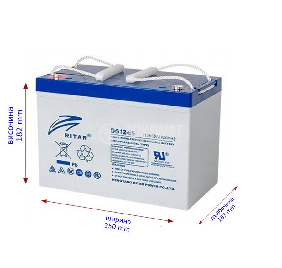 Rechargeable Gel battery DG12-65 lead-acid, maintenance-free, RITAR, at 12 V / 65 Ah. Suitable for emergency power supplies, security systems, electric vehicles, etc. Dimensions - 350x167x182 mm. Rechargeable, encapsulated rechargeable battery.