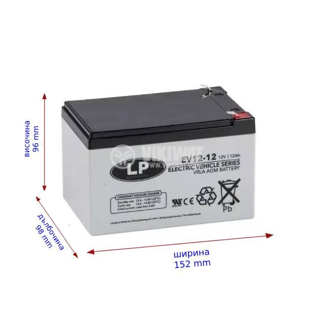 Rechargeable battery EV12-12 lead-acid, maintenance-free, RITAR, at 12 V / 12 Ah. Suitable for emergency power supplies, security systems, electric vehicles, etc. Dimensions - 152x98x96 mm. Rechargeable, encapsulated rechargeable battery.