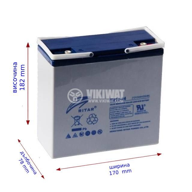 UPS battery EV12-24 lead acid, non-serviceable, RITAR, at 12 V / 24 Ah. Suitable for UPS power supplies with long life. Dimensions - 182.5x78.5x170 mm. Rechargeable, encapsulated rechargeable battery.