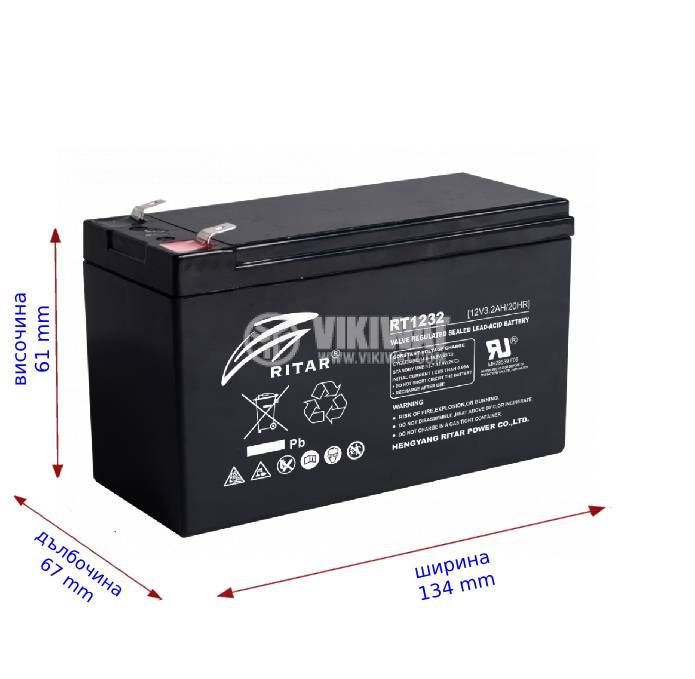 Rechargeable battery RT1232 lead-acid, maintenance-free, RITAR, at 12 V / 3.2 Ah. Suitable for emergency power supplies, security systems, electric vehicles, etc. Dimensions - 134x67x61 mm. Rechargeable, encapsulated rechargeable battery.