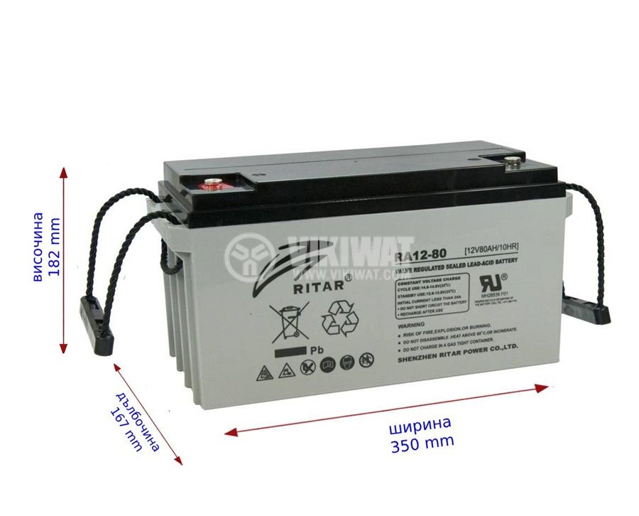 Rechargeable battery RA12-80 lead-acid, maintenance-free, RITAR, at 12 V / 80 Ah. Suitable for emergency power supplies, security systems, electric vehicles, etc. Dimensions - 350x167x182 mm. Rechargeable, encapsulated rechargeable battery.
