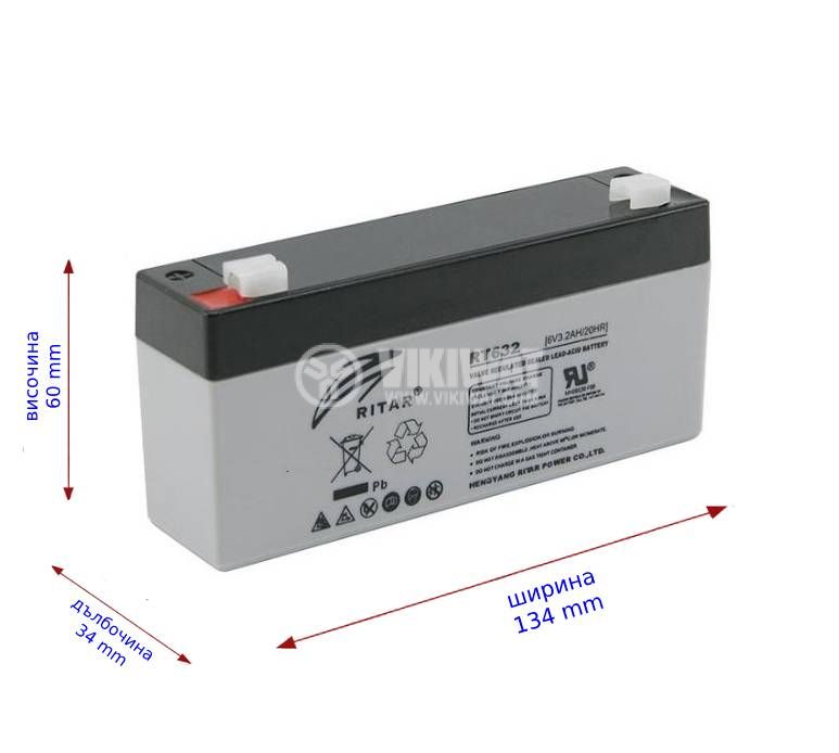 Rechargeable battery RT632 lead-acid, maintenance-free, RITAR, at 6 V / 3.2 Ah. Suitable for emergency power supplies, security systems, electric vehicles, etc. Dimensions - 134x36x60 mm. Rechargeable, encapsulated rechargeable battery.