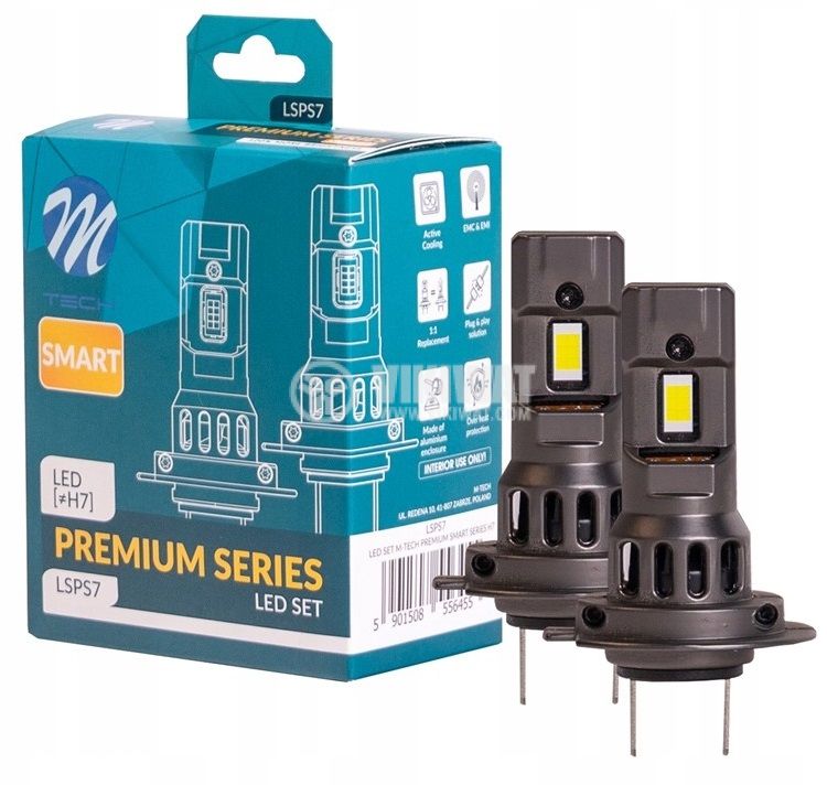 Set of LED car bulbs H7, in cold white light, with a power of 70 W, suitable for headlights, by direct connection to the installation. Set contains two bulbs.