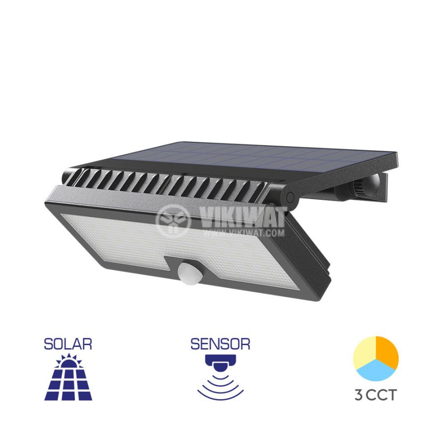 Solar LED 10 W lamp with sensor for motion. During the day, the battery is charged by sunlight through a solar panel and the charging time is 12-15 hours.