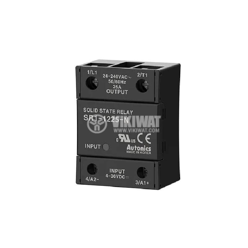 SSR полупроводниково реле с общо предназначение, монофазно с максимално комутационно напрежение 24~240 VAC, максимален ток на товара 25 A и управляващо входно напрежение от 4 VDC до 30 VDC.